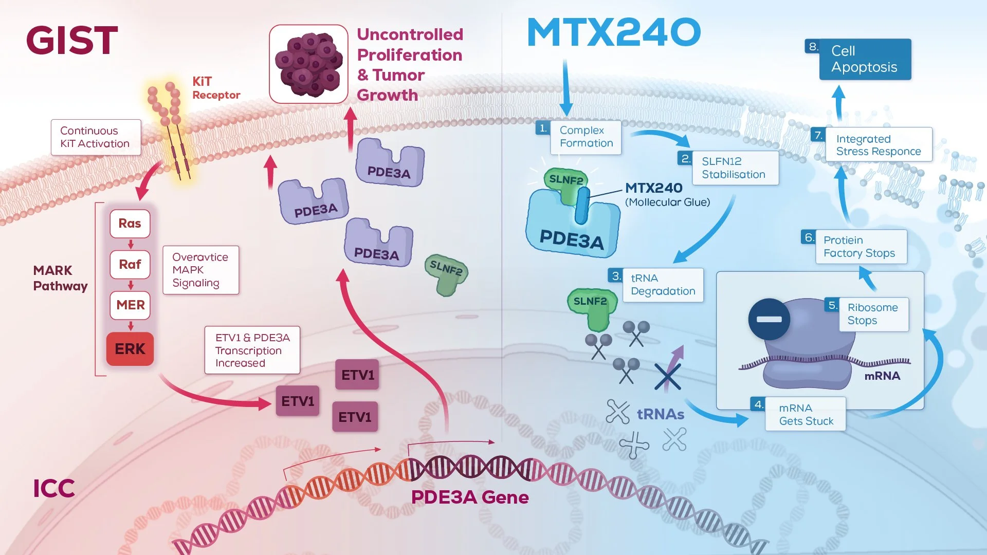 Illustration work done for the client Biodexa Pharmaseuticals, showing the MOA of their MTX240 agent. Its unique molecular glue mechanism of action separates MTX240 from current standard of care with the potential to benefit a broad spectrum of GIST patients.